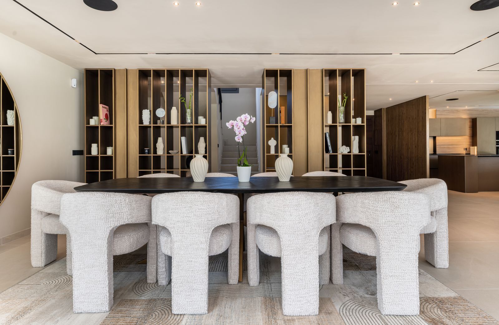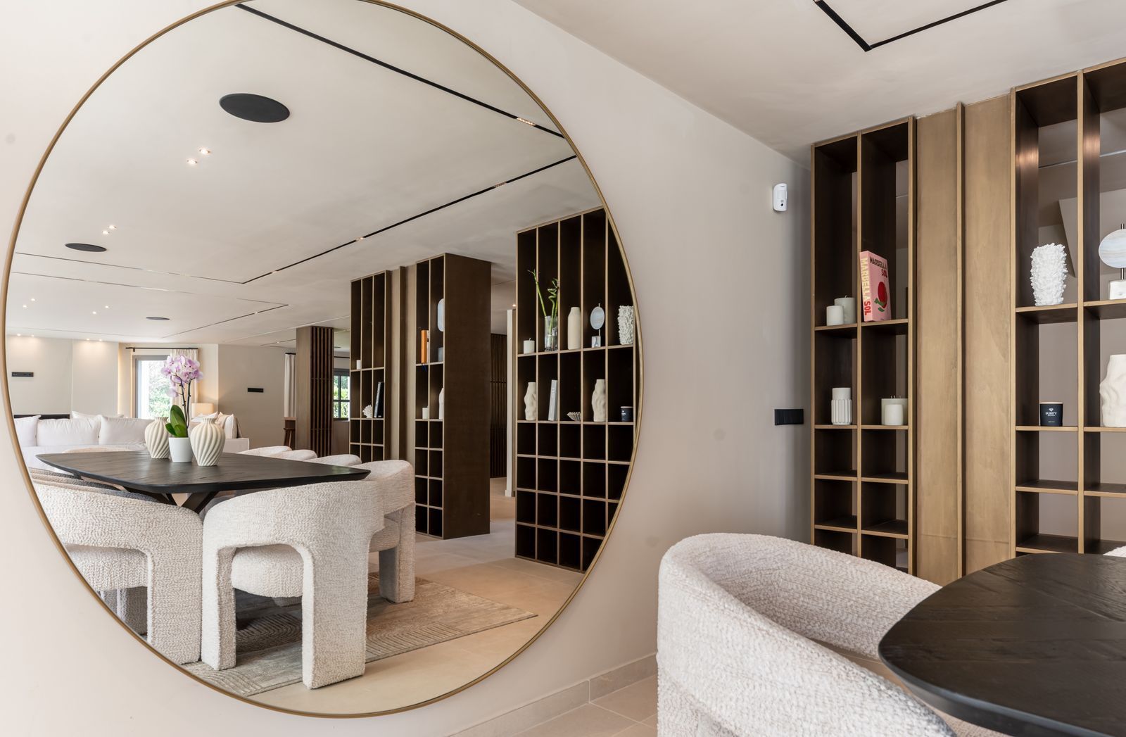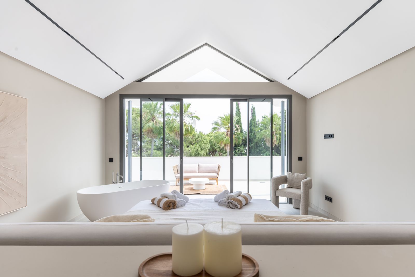 Inside, the atmosphere is warm and inviting, with modern finishes softened by natural wood accents. The open-plan kitchen and dining area flow seamlessly, with the kitchen fitted with high-quality Siemens appliances for those who love to cook. The living space opens directly onto a charming chill-out terrace, perfect for unwinding with friends or enjoying a quiet evening. Every corner of the home has been designed with comfort and hospitality in mind. Interior & exterior furniture by KOA Interior.