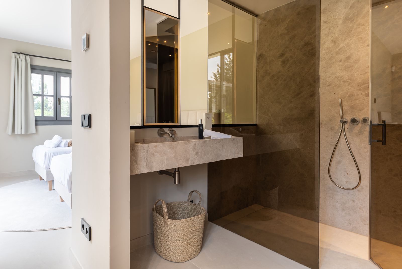 The villa boasts two master suites, each designed as a private retreat with expansive windows that fill the rooms with natural light and frame serene garden views. Both master bathrooms offer a luxurious spa-like experience, ensuring comfort and indulgence for owners and guests alike.
