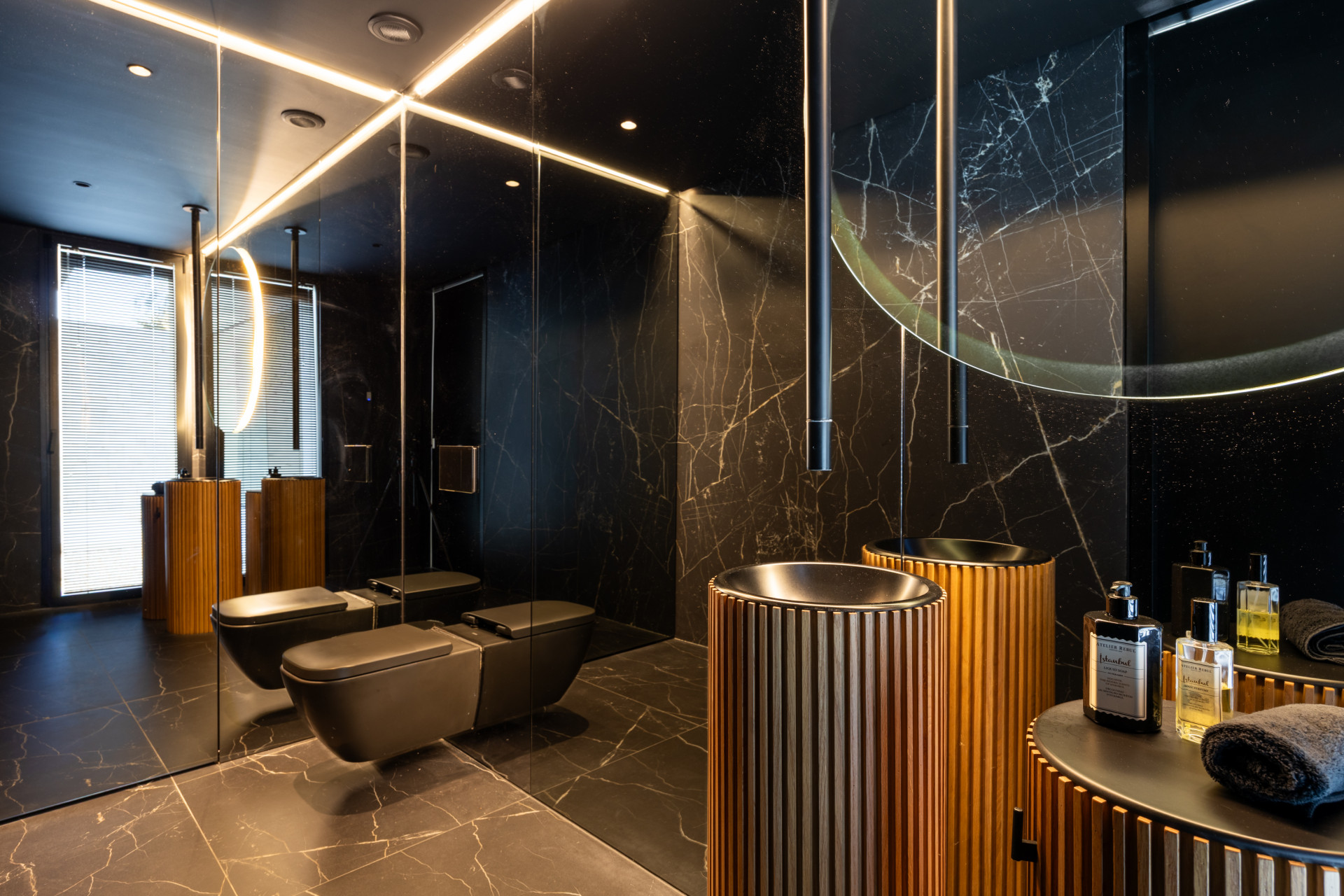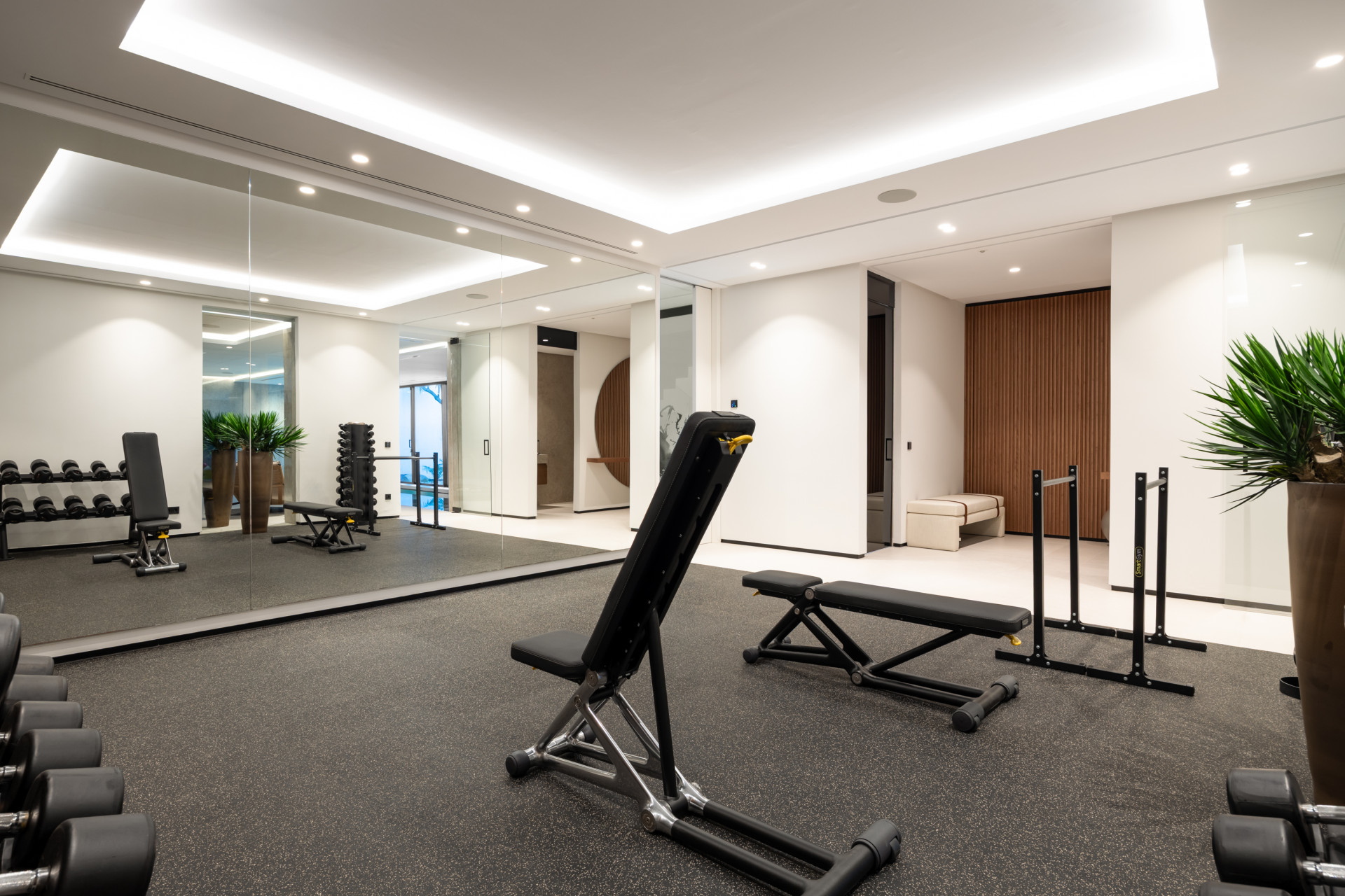 The lower level is designed for relaxation and wellness, with a private spa that includes a heated indoor pool, sauna, hammam, and a fully equipped gym. This floor also features a stylish bar area, ideal for entertaining. In addition, there are two further guest suites and a separate apartment with its own living room, fully equipped kitchen, bedroom, and bathroom, offering a versatile and private space for guests.