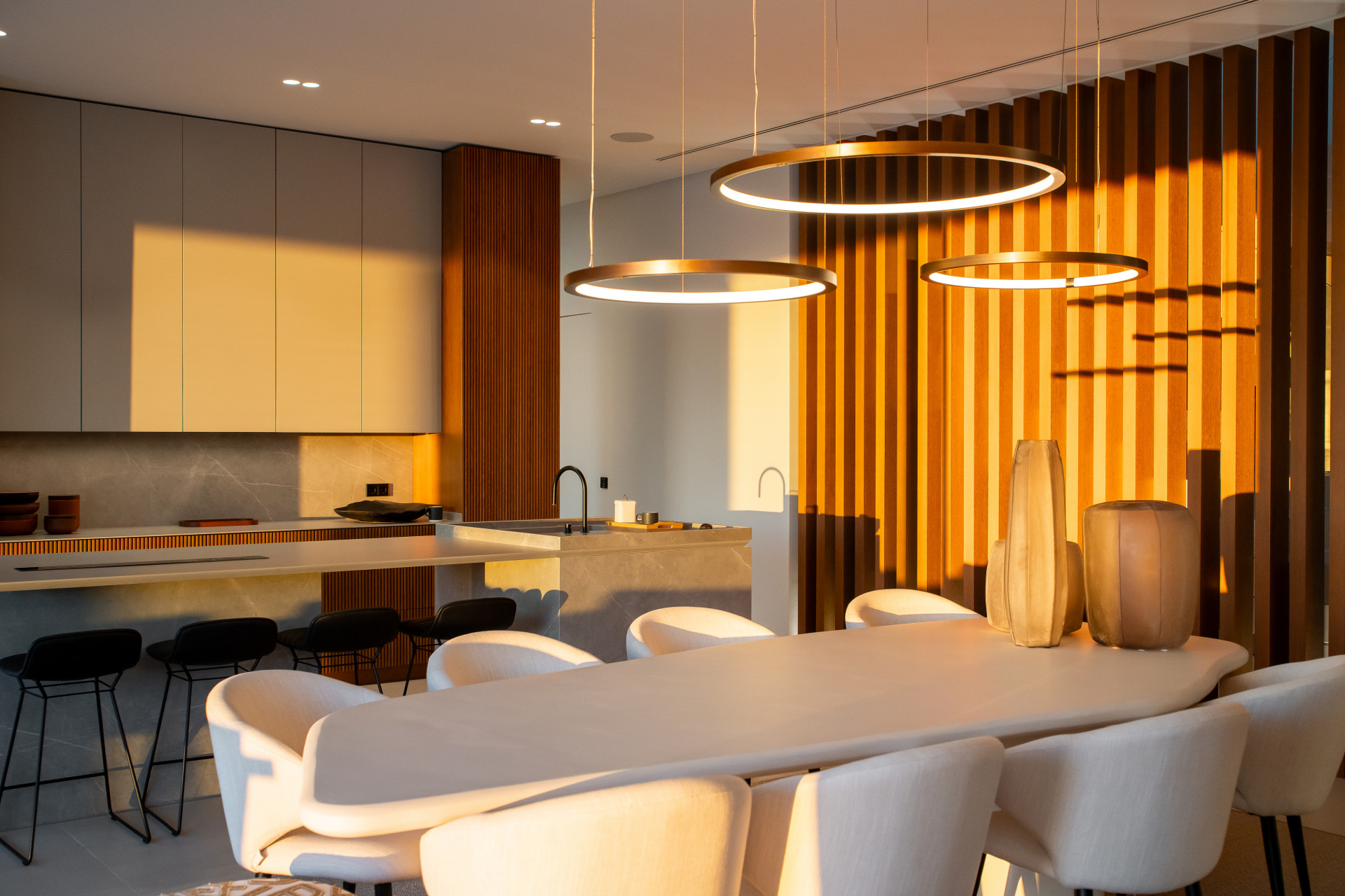 Designed to make the most of its surroundings, the villa revolves around a bright open-plan living space with panoramic views of the mountains and the sea. A striking entrance leads into an impressive double-height living area, which flows seamlessly into an elegant lounge, formal dining area, and a modern designer kitchen. A beautifully appointed guest suite is also located on this level. Floor-to-ceiling windows open onto spacious terraces and a stunning infinity pool, creating a seamless indoor-outdoor living experience and allowing the views to be enjoyed throughout.