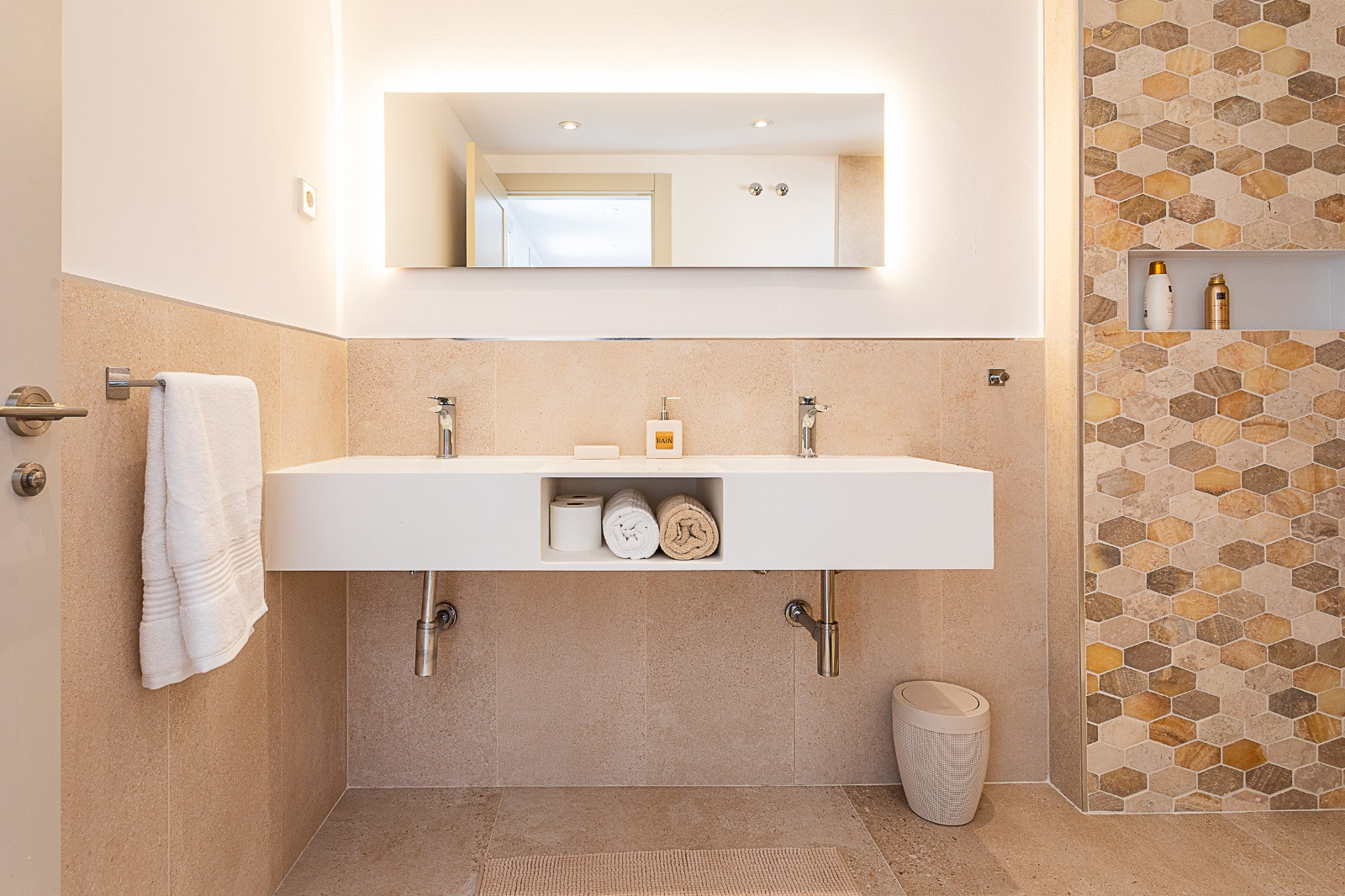 The main terrace is further enhanced by a 25 m² pergola with electric sunshades, allowing for comfortable al fresco dining and relaxation throughout the year while taking in the spectacular surroundings.