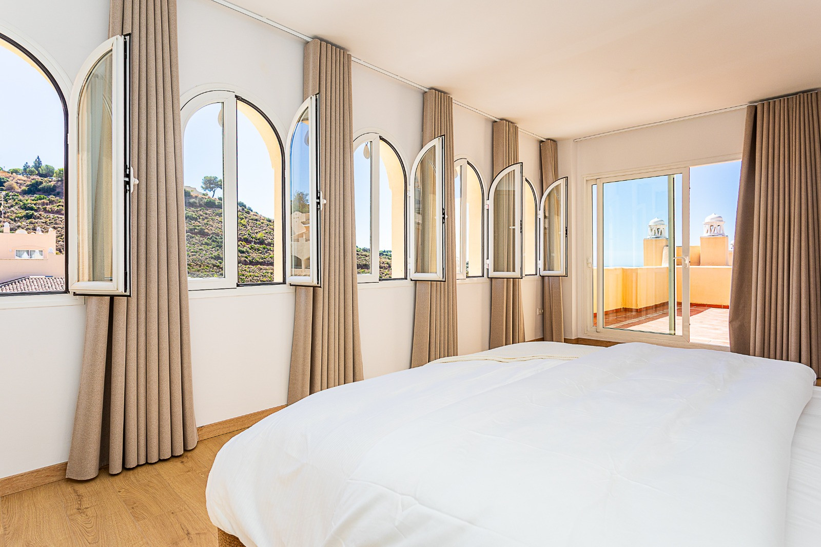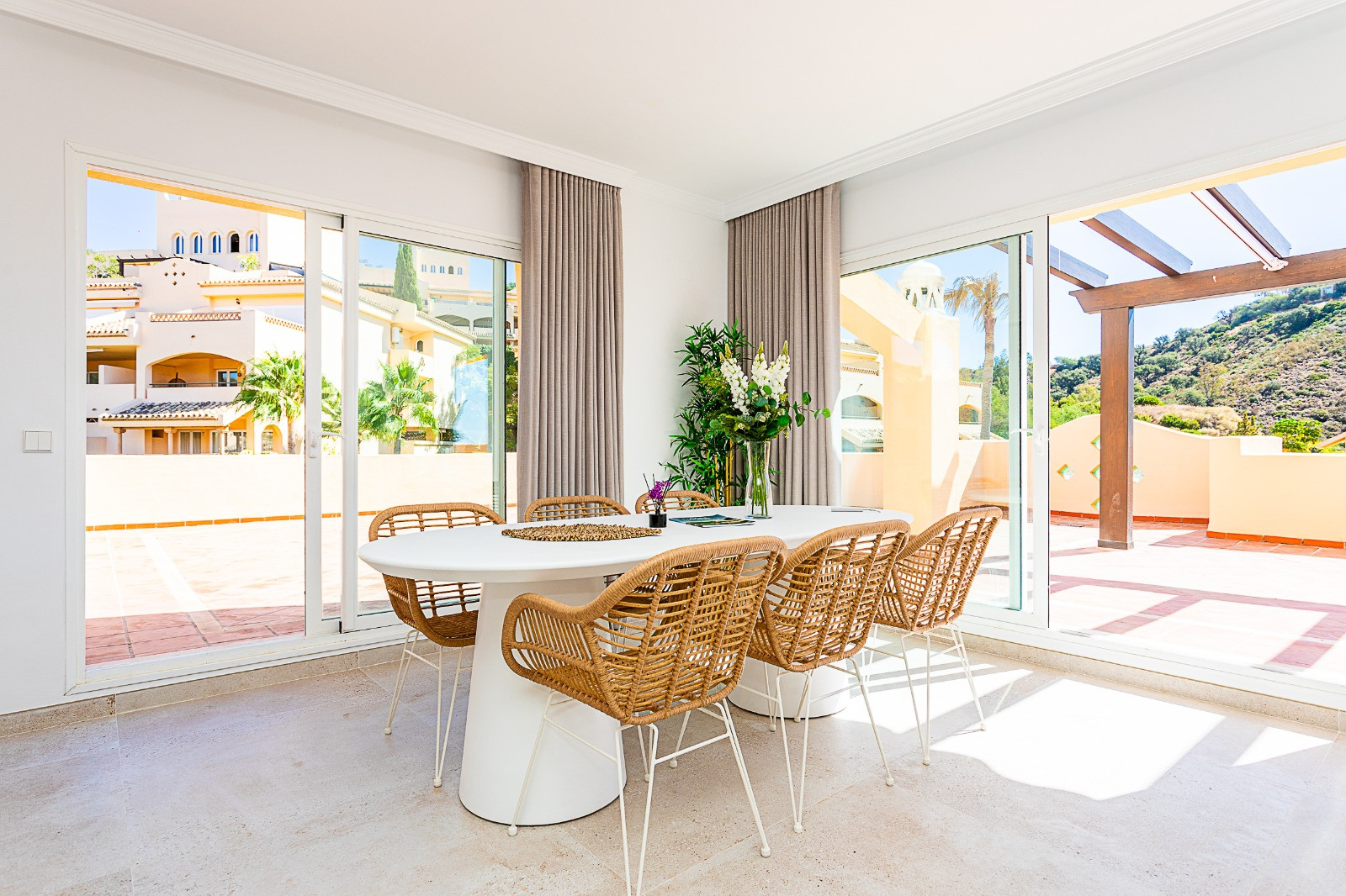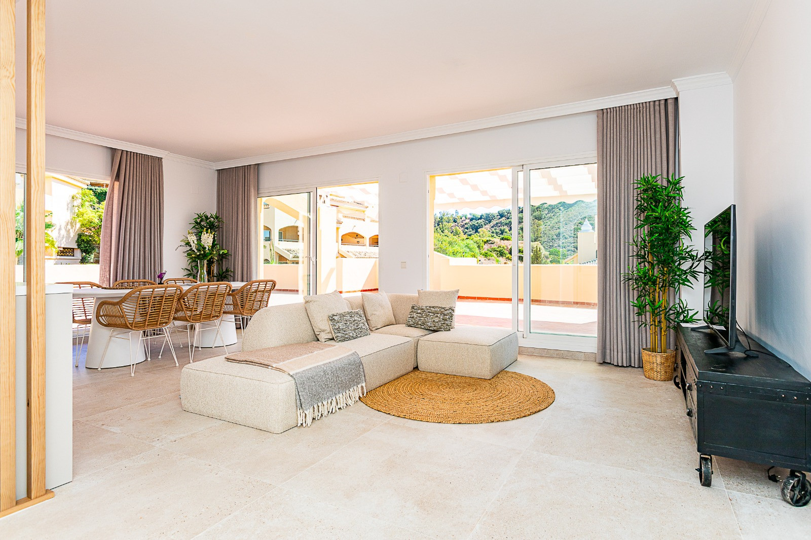 The property features a spacious open-plan living area, seamlessly connected to the outdoors through three sets of double doors that lead onto an impressive 200 m² terrace—perfect for entertaining and enjoying panoramic views.