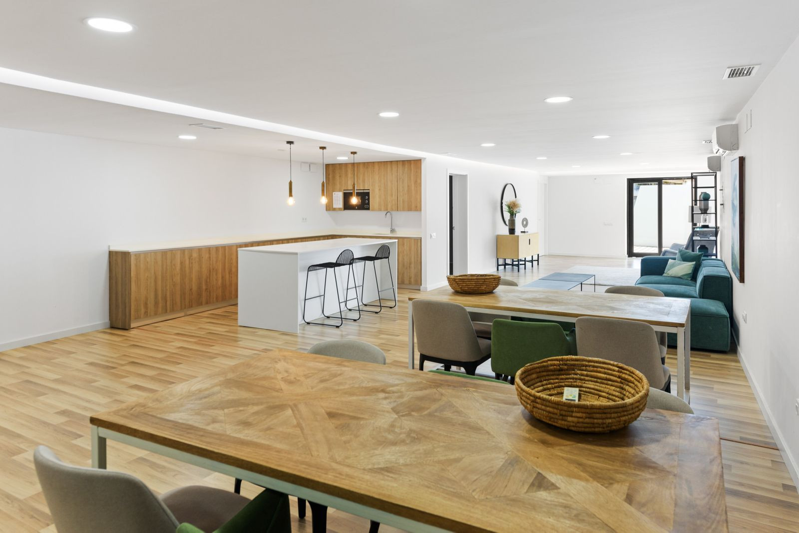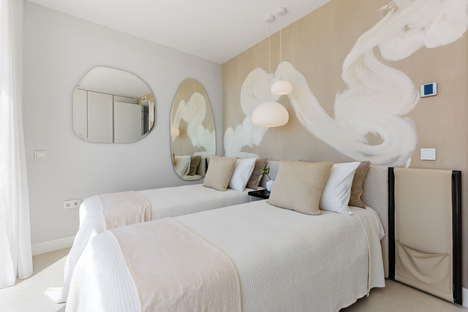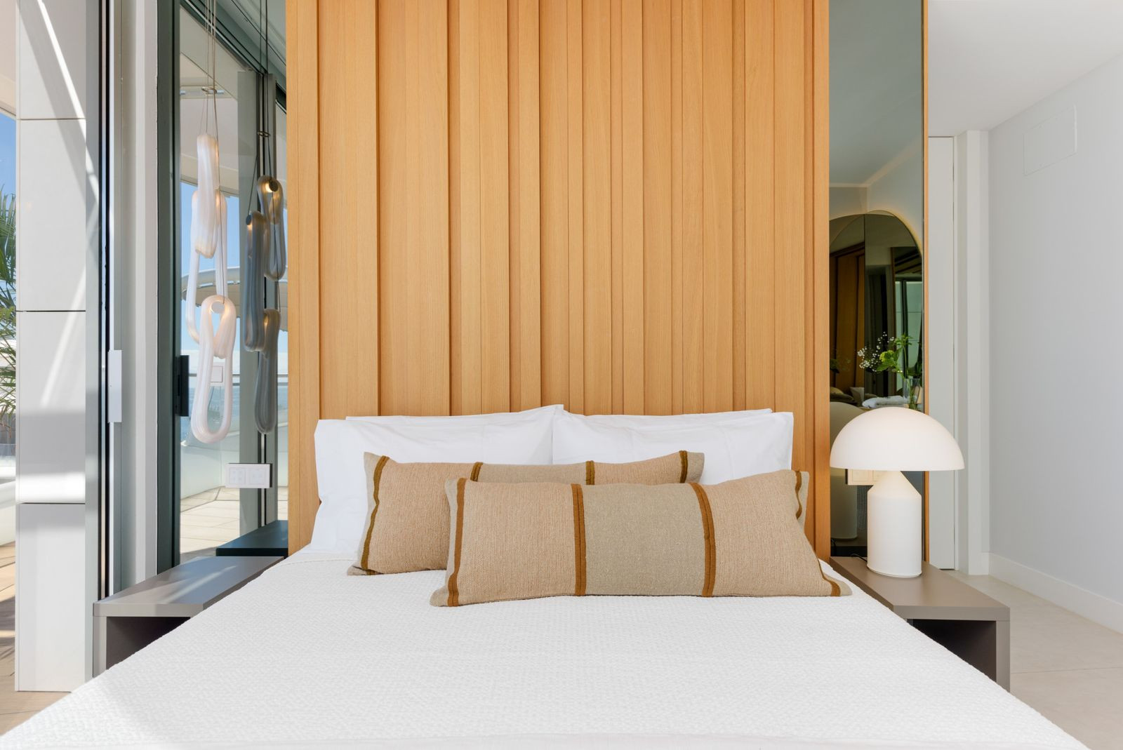 Accommodation comprises three bedrooms, including a principal suite with direct terrace access and sea views. Bathrooms are finished to a high standard, complementing the clean, modern aesthetic throughout.