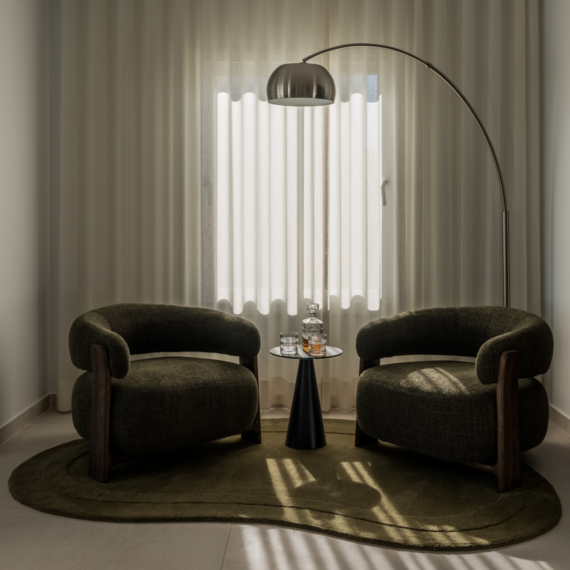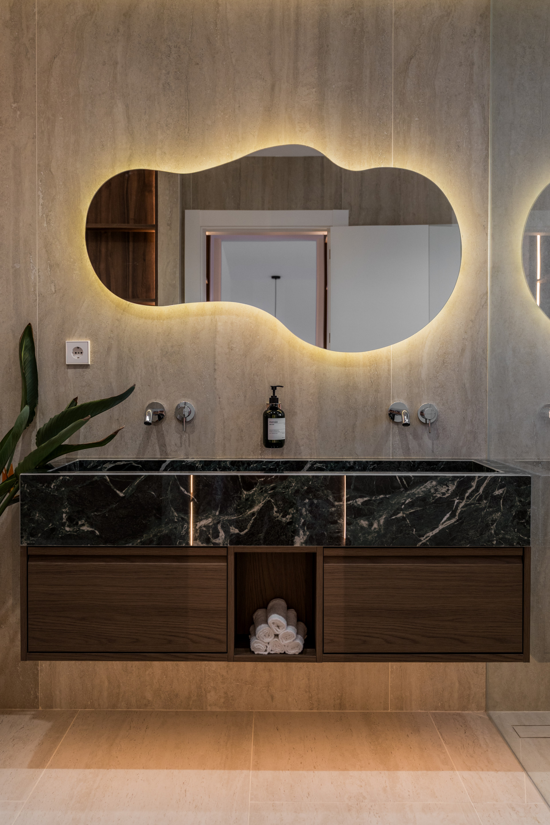 The kitchen stands out with elegant marble worktops and includes a bespoke wine area, adding a touch of sophistication. This level also offers a guest bedroom with an en-suite bathroom and its own private terrace, ensuring both comfort and privacy.