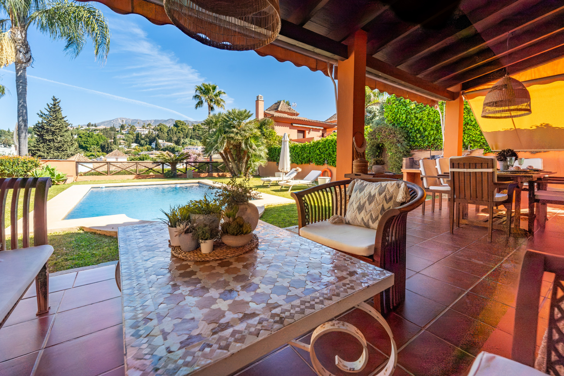 From the moment you enter, the home offers a sense of space and comfort. The spacious and inviting living room opens directly onto the terrace, garden, and private swimming pool, creating the perfect setting to enjoy the Costa del Sol lifestyle all year round, with pleasant mountain views.